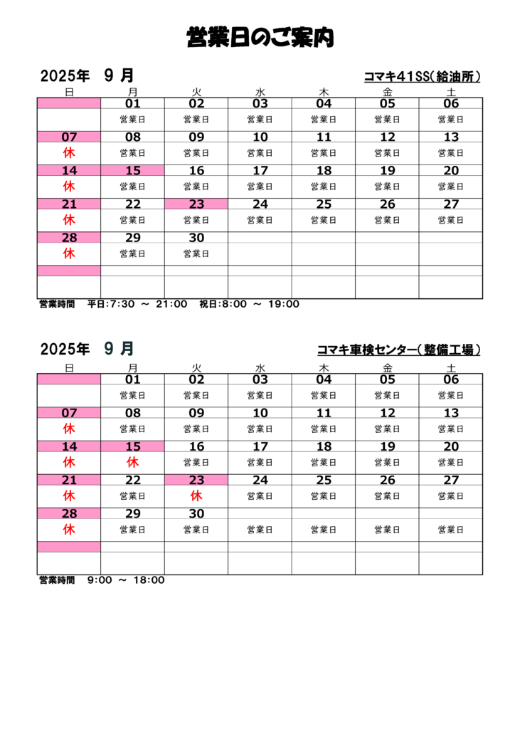 コマキ車検センター(車検整備工場)2025年9月の営業案内【コマキ車検センター】