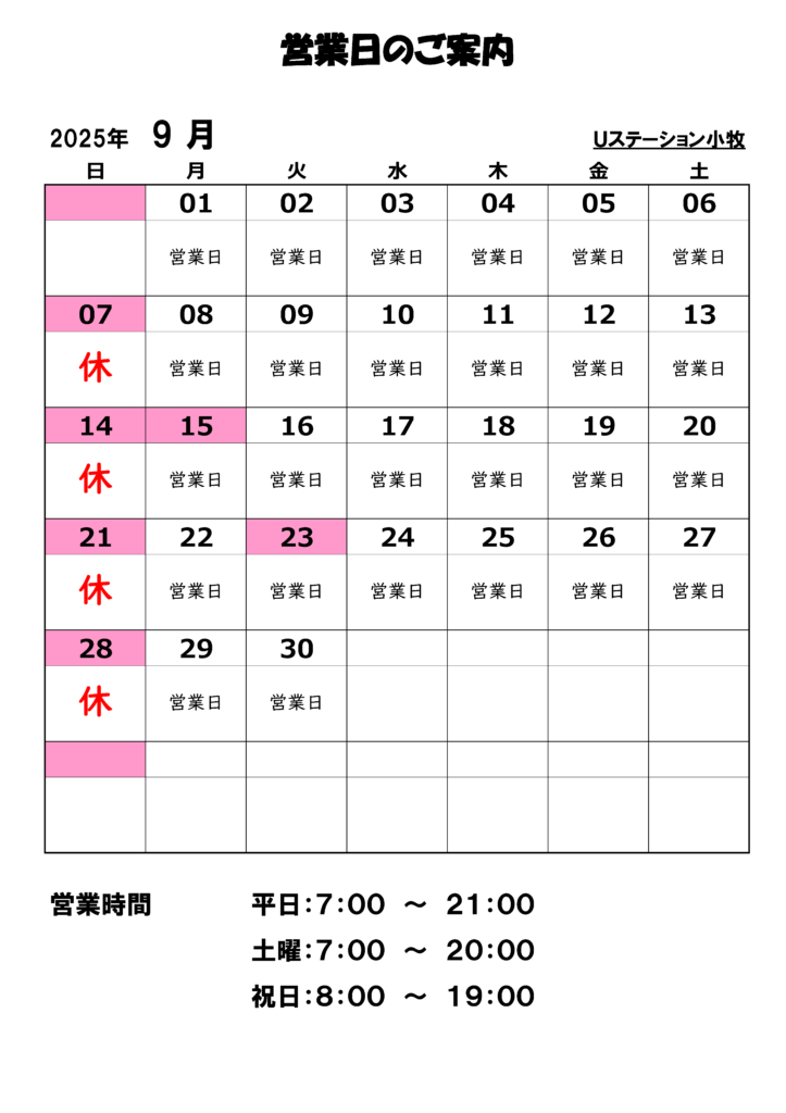 Uステーション小牧 9月の営業案内です。【Uステーション小牧SS】