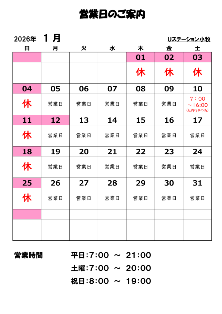 Uステーション小牧SS 2026年1月の営業案内【Uステーション小牧SS】