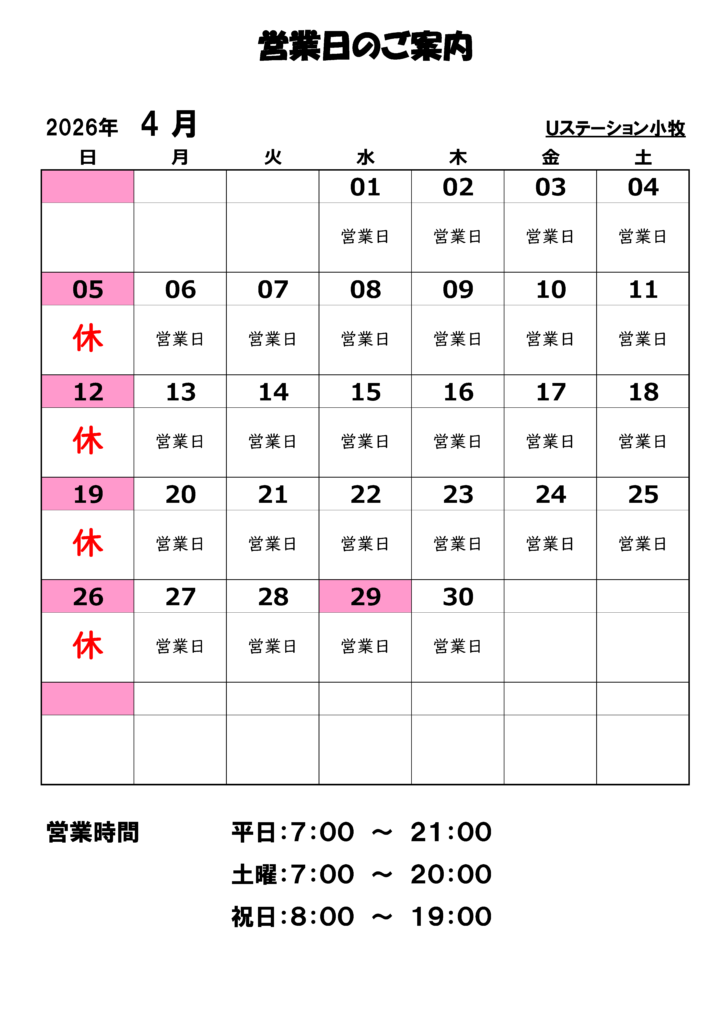 Uステーション小牧SS 2026年4月の営業案内【Uステーション小牧SS】