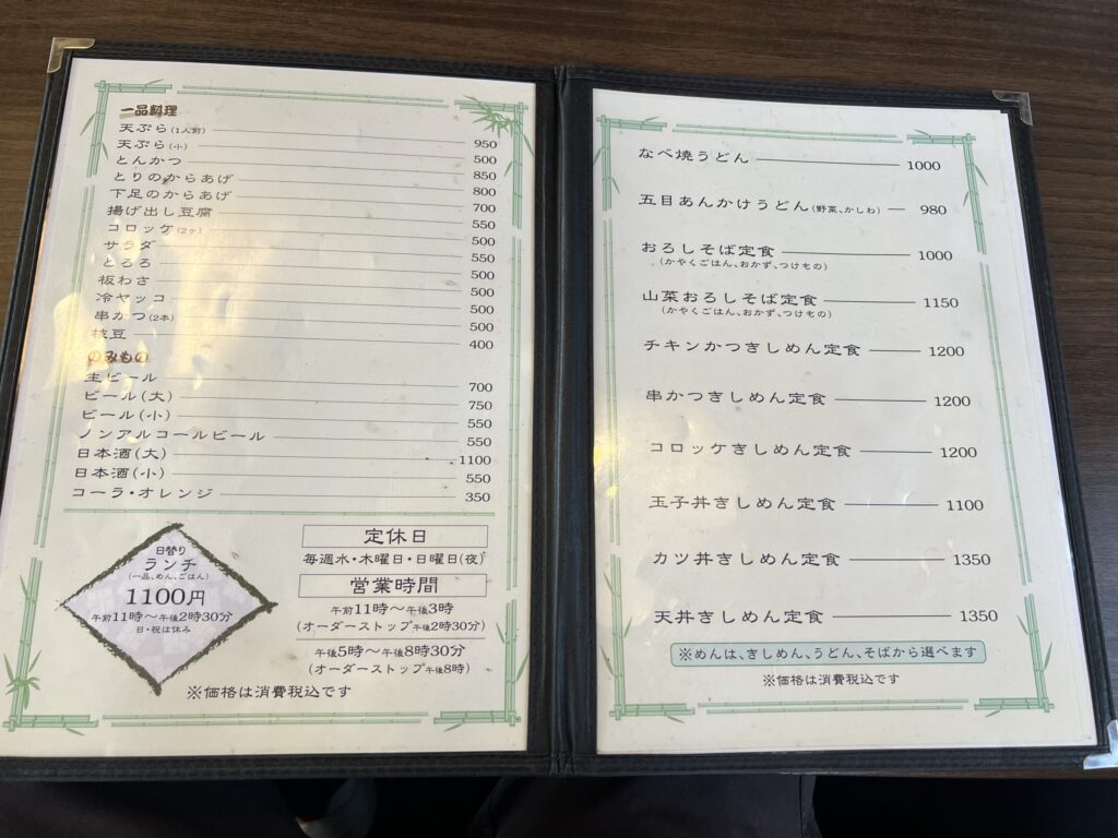 メニューになります。めんは『そば・うどん・きしめん』で選ぶことができます。