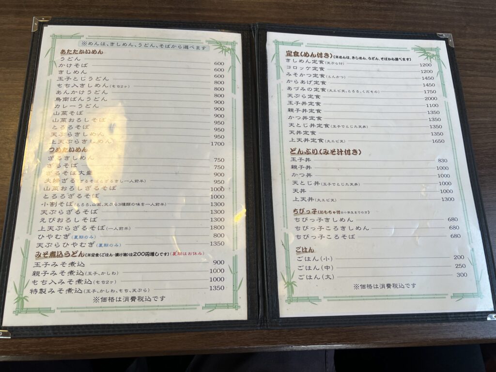 メニューになります。めんは『そば・うどん・きしめん』で選ぶことができます。